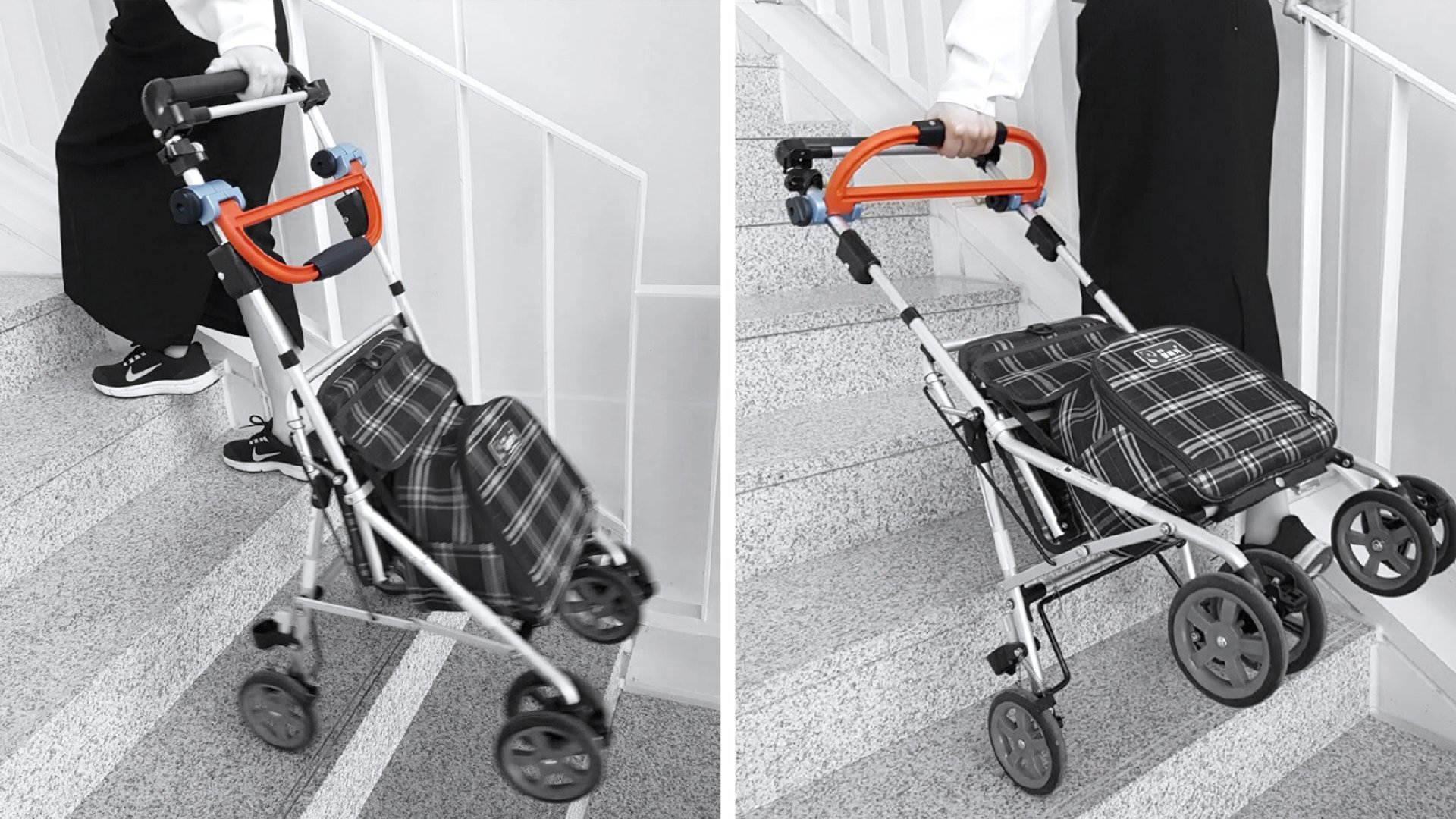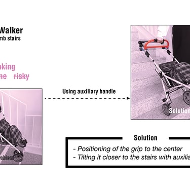 This idea all started when I saw an old lady pushing her cart. It made me wonder how I could help her. So I set up an impromptu interview with the elderly woman. Furthermore, I gathered details in an elderly shelter. I then realized it gets heavier when going up the stairs because it tends to tilt downwards. There was only one thing missing. They only needed an auxiliary handle to solve the issue.